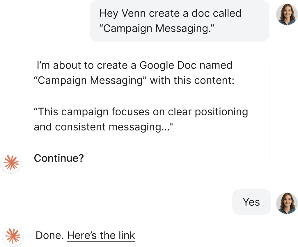 Start your prompt with “Hey Venn…” and instructions on the task you want done and stay in the loop
